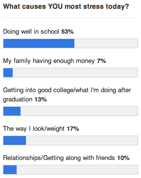 Second, I wasn’t surprised that school concerns are one of the greatest sources of stress. College admission is more competitive than ever and with rising tuition costs and economic recession students are trying to bolster their chances at scholarships by having a full and impressive portfolio of achievements and awards, solid GPA and high ACT scores. Parents often add to the academic pressure as they too will benefit largely from a financial scholarship!