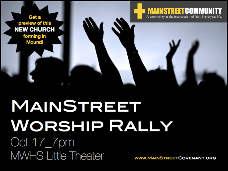 Save the date! Tell your friends! MainStreet is “going public” and inviting the entire town to join us at the MWHS Little Theater for a night of celebration and worship! If you’re curious about MainStreet and have friends interested in finding out who we are, this is the chance to find out!