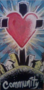 Yet, I am so excited to be looking at, touching with my hands, displaying for our team to see, these pictures that help bring the vision of MainStreet more to life than words can often do. These poor quality photos don’t do justice to the bright colors and texture of these large wooden 4 foot wide paintings. You’ll have to come out this Sunday night to see them properly displayed on stage at the MainStreet Worship Rally.