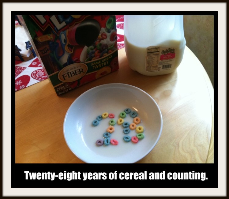 She walked into my life.  And its been nothing but fun, giggles and adventure ever since!  Here’s an old photo from one of our first birthdays together.  And another tribute to Keri written in her special love language — cereal. :)