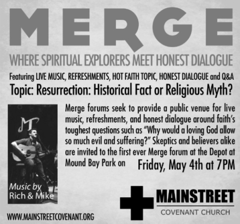 MainStreet’s MERGE forums strive to provide a public venue for believers, skeptics and seekers to have open discussion on some of faith’s toughest questions such as “Did Jesus really rise from the dead?” or “How could a loving God allow so much evil and suffering?” or “Is the Bible trustworthy?”