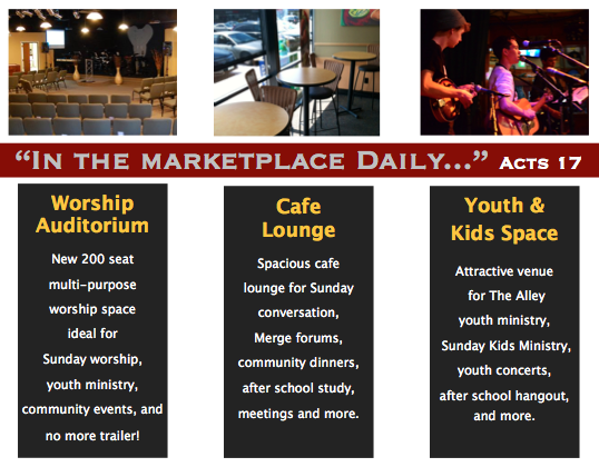 Our location places us in an active shopping center off a major road (Shoreline Drive) with the Early Childhood Family Education center on one side and the Western Communities Action Network (WeCAN) on the other. We are ideally situated to reach both young families disconnected from church and hurting people looking for support and hope. The new facility will include a spacious cafe/lobby, 150-200 seat worship area, kids ministry area and nursery, pastor’s office and conference room, large restrooms and much needed storage. We will have an attractive ministry space for Sunday morning worship as well as weekday ministries including The Alley youth ministry, adult classes, prayer gatherings, Friday night open mic events, youth outreach concerts, Merge forums, after school spot for youth, and much more!