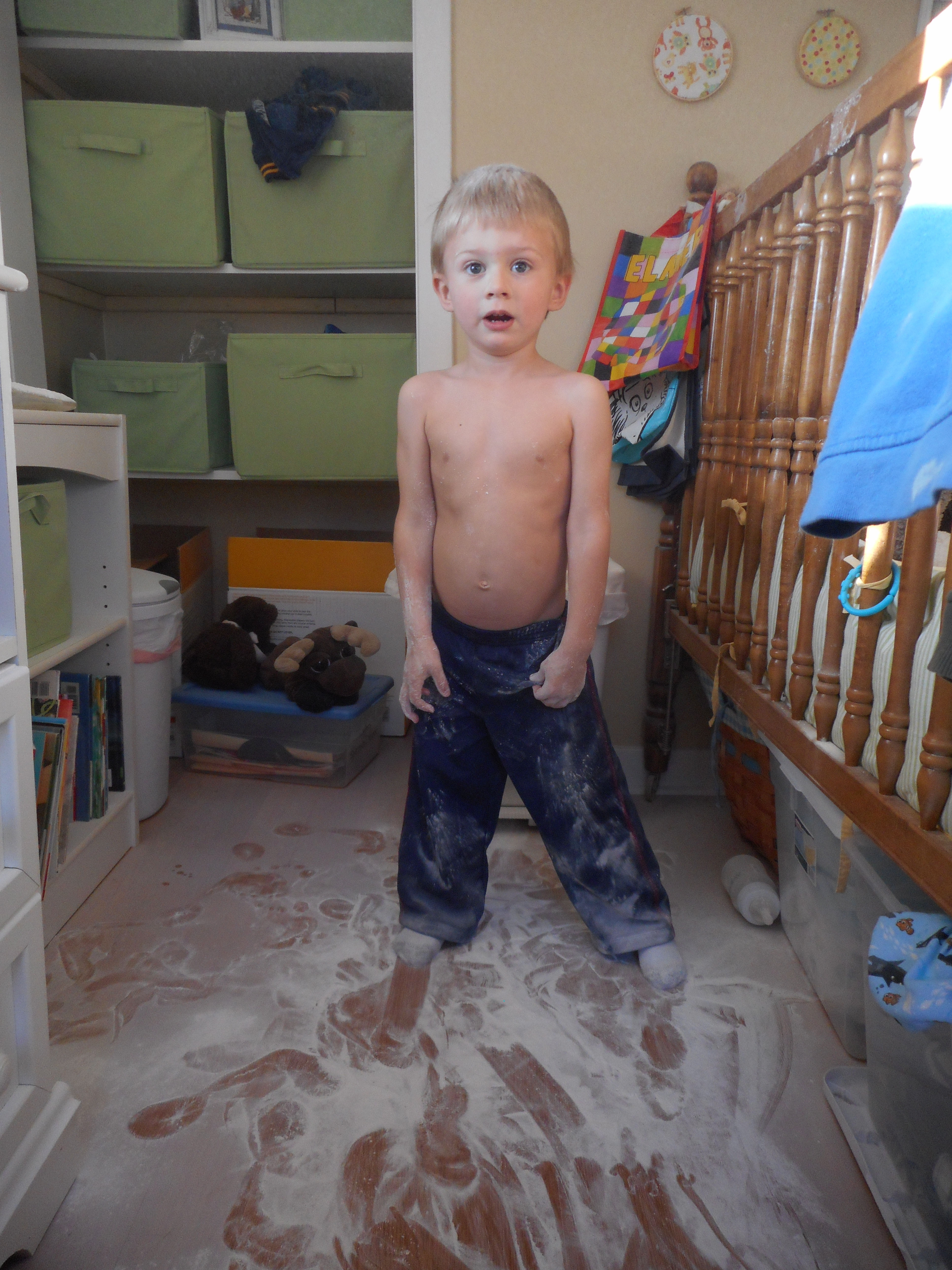 3. Baby Powder Incident. But the most memorable daddy moment by far began on a typical weekday morning. I jumped in the shower for 5 minutes with Peter playing in his room and Isaak still in his crib. A couple minutes later I heard giggling coming from the nursery and knew Peter was up to something. I ran to the room and walked into a white cloud of baby powder. Peter had dumped the entire first container out all over every surface, and even worse we had a space heater running and blowing it around like a snowmaker. He was holding the second container and dumping it all over his