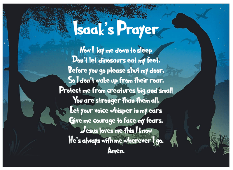 I came up with a fun faith-building and imaginative project this weekend. I sat down with each kid and we wrote a custom bedtime prayer together. They chose the theme and background image, and helped me pick out a cool font to go with it. Then we had fun with rhymes. Printed them out and put them in frames to go over their bed. They are so proud. Check ’em out and try your own!