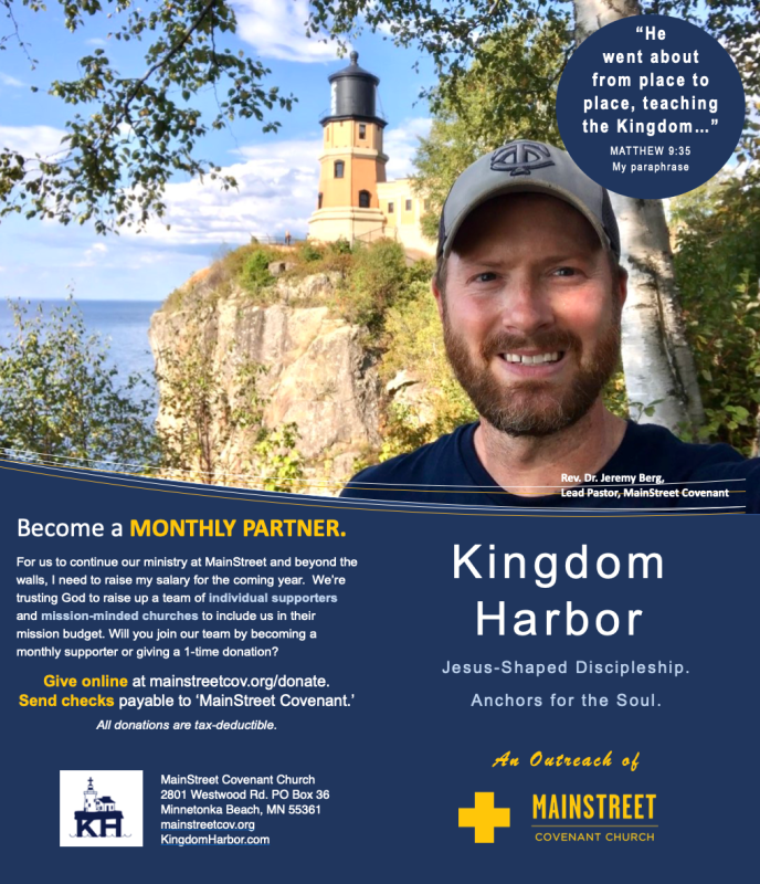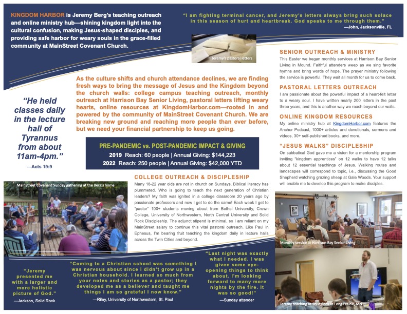 Since MainStreet is reaching and impacting more people with our teaching than EVER before in our 12 year journey, I am being bold and asking God to raise up the funding to continue this expanding reach. Before the pandemic in 2019, we had a budget of $144,000 and were reaching about 60 regular attenders. This year we are reaching 250+ people with our college outreach, our new monthly ministry at the Harrison Bay Senior Living facility in Mound, and our MainStreet community. Sadly, our total funding this year so far is just over $40,000.