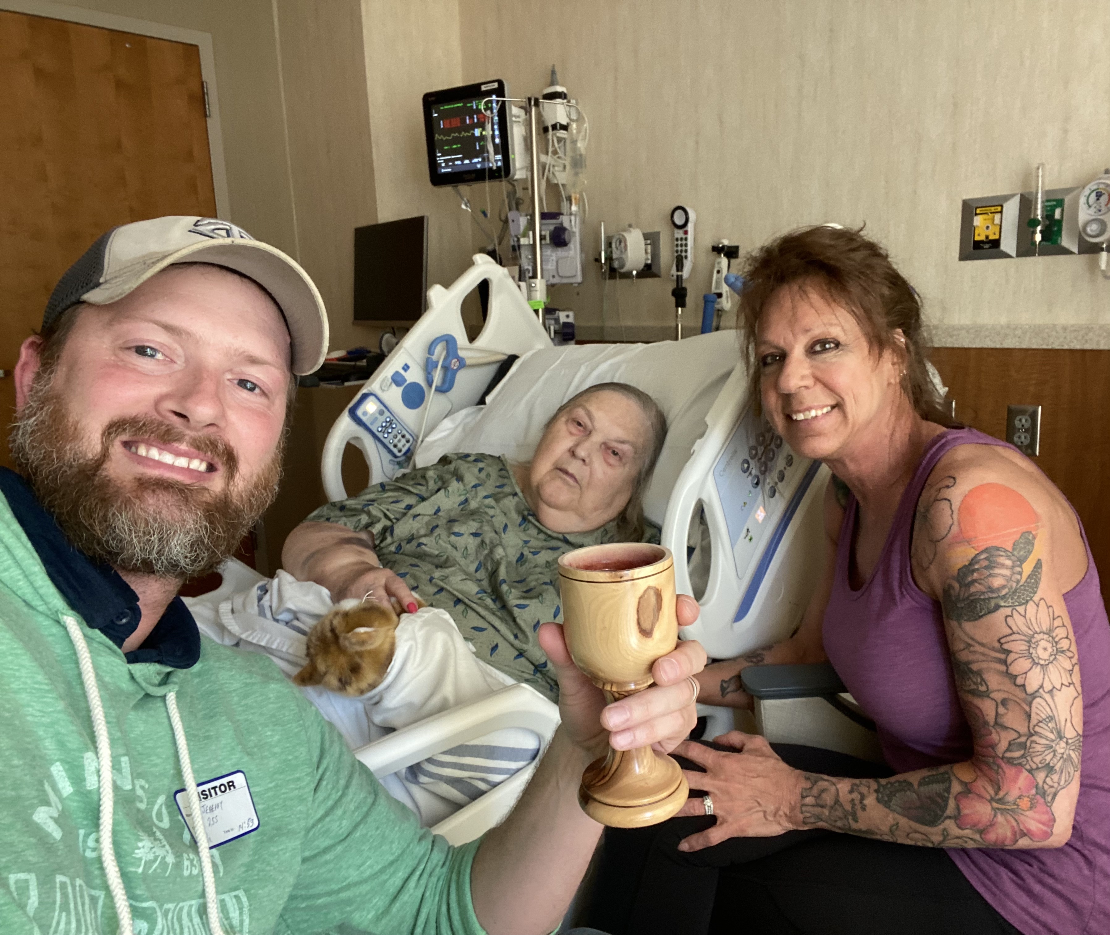 For me, I will always cherish my visits and chats at Bonnie’s kitchen table, trying to hold a conversation while her dog brushed his wet snout against my leg. We once shared communion at that table, and its the closest I’ve come to having a four-footed creature join in the holy sacrament. Speaking of communion, in her last days at Waconia Hospital I had one more chance to share the Lord’s Supper with her. When I had visited a couple days earlier, she was unresponsive and never woke. So, on my drive over I prayed that I would find her awake and alert and present so we could share one more special time of communion and conversation. Prayers answered!