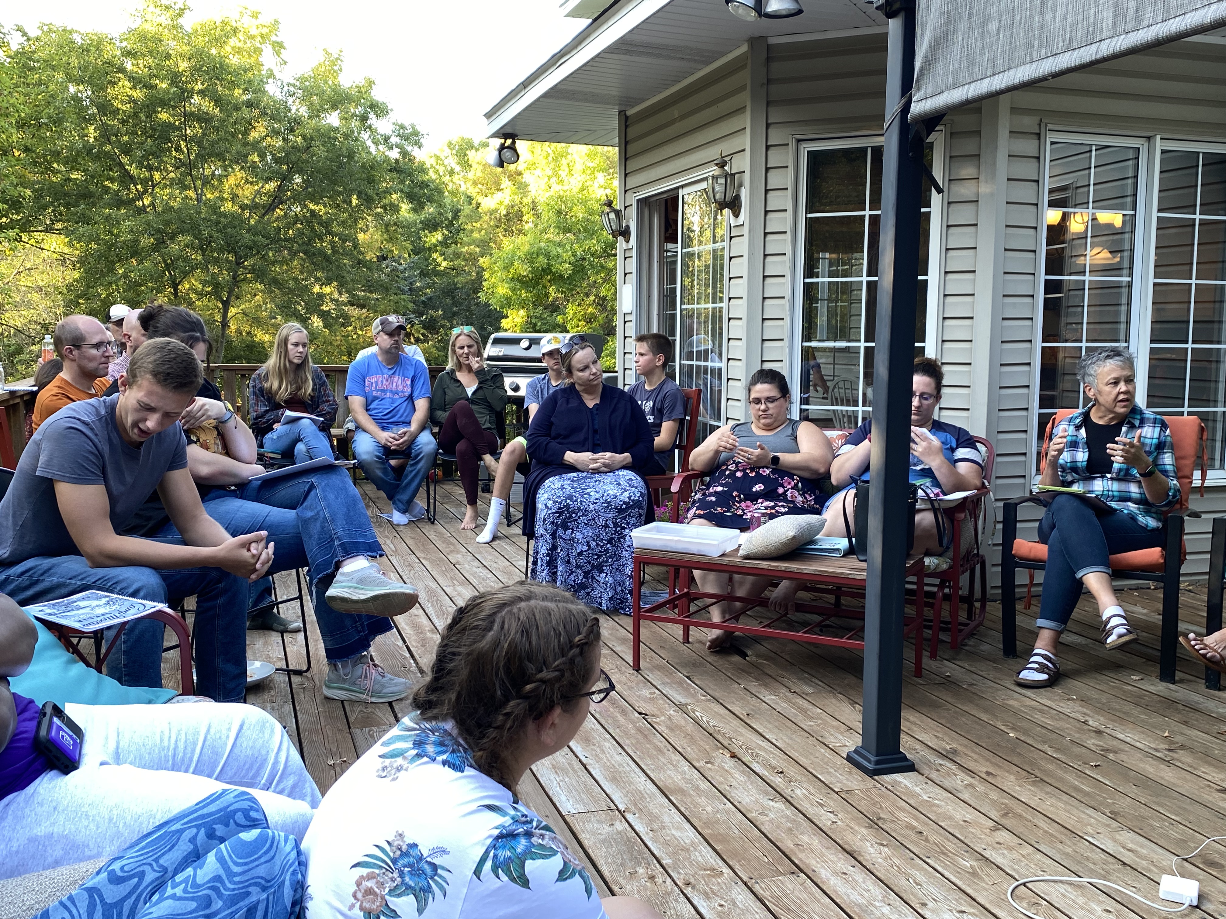 Last night’s Sunday gathering had our home bursting at the seams, with a handful of new college students checking us out and new friend Karen introducing our church to the practice of Spiritual Direction. We have several musicians among us now, and so we enjoyed folky worship on the deck featuring a violin, banjo and guitar. Kittens and chickens joined our chorus on a spectacular fall weather weekend.
