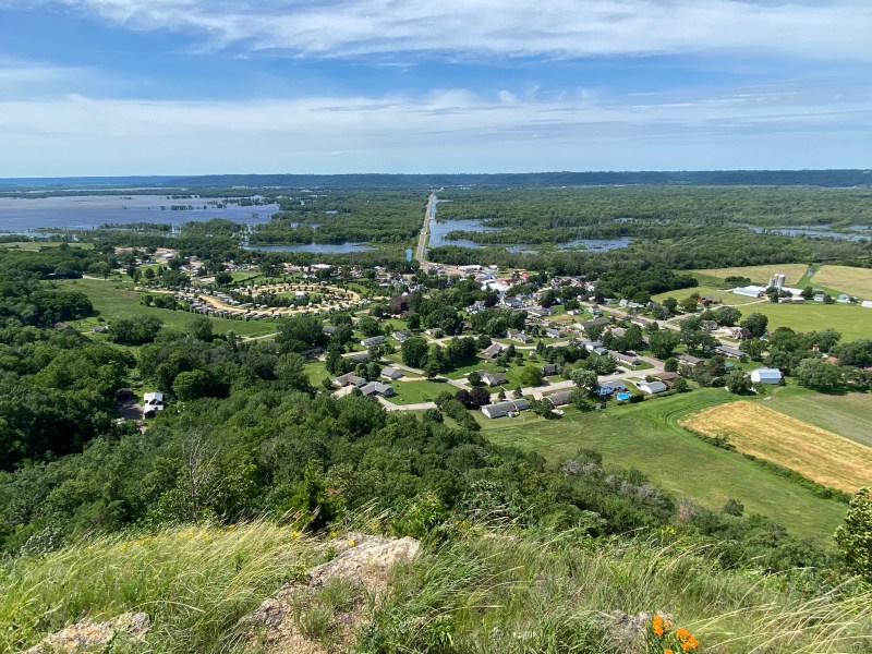 The rocky outcrop of the bluff is called Pike’s Peak and looks down on the small Village of Nelson with a population of 320. Sitting high above the village, the tiny cars and houses looked like game board pieces, tiny plastic houses from Monopoly and plastic cars and pin-headed people from the game of Life. The people were colorful walking specks, little dots just like us towering over an ant colony.