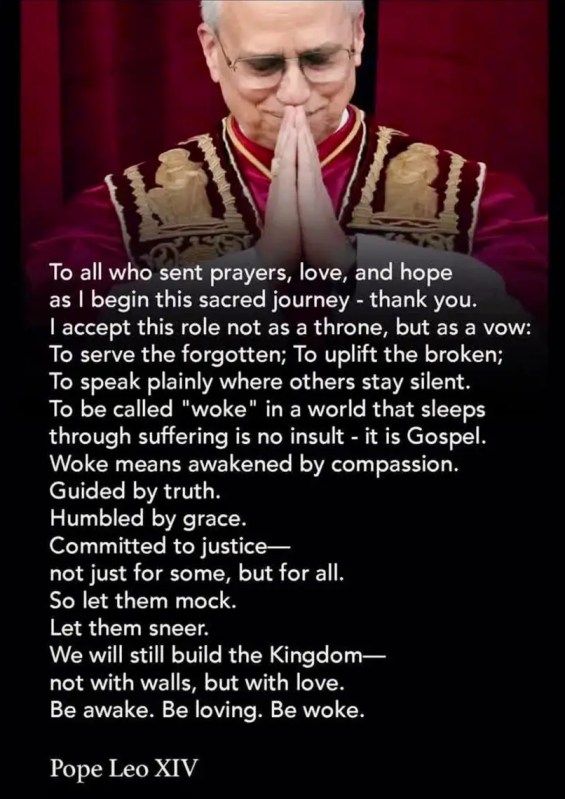 “To be called “woke” in a world that sleeps through suffering is not insult – it is Gospel. Work means awakened by compassion. Guided by truth. Humbled by grace. Committed to justice–not just for some, but for all. So let them mock. Let them sneer. We will still build the Kingdom–not with walls, but with love. Be awake. Be loving. Be woke.” -POPE LEO XIV