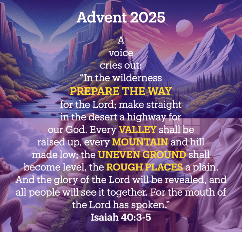 A voice cries out: “In the wilderness prepare the way for the Lord; make straight in the desert a highway for our God. Every VALLEY shall be raised up, every MOUNTAIN and hill made low; the UNEVEN GROUND shall become level, the ROUGH PLACES a plain. And the glory of the Lord will be revealed, and all people will see it together. For the mouth of the Lord has spoken.”