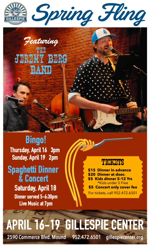 While I perform solo gigs all year round, once a year I get to rock out with a full band! Saturday night my friend Jared King and I will be performing at the Gillespie Center’s Spring Fling fundraiser from 7:00-9:30 in Mound, MN. This is fun on many levels, but the best part is making music with our kids.